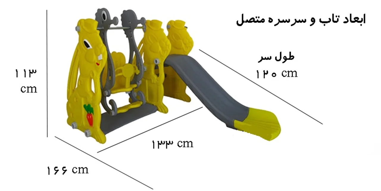 فضای مورد نیاز برای این مجموعه 3 متر مربع میباشد. همچنین این مجموعه تاب و سرسره بسیار مناسب مهد کودک و خانه بازی میباشد زیرا همزمان چندین کودک را سرگرم میکند و کاربرد فراوان دارد.