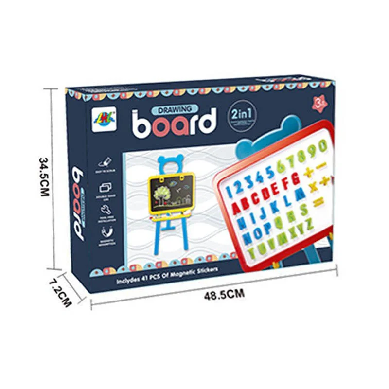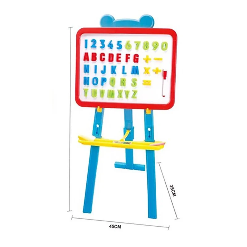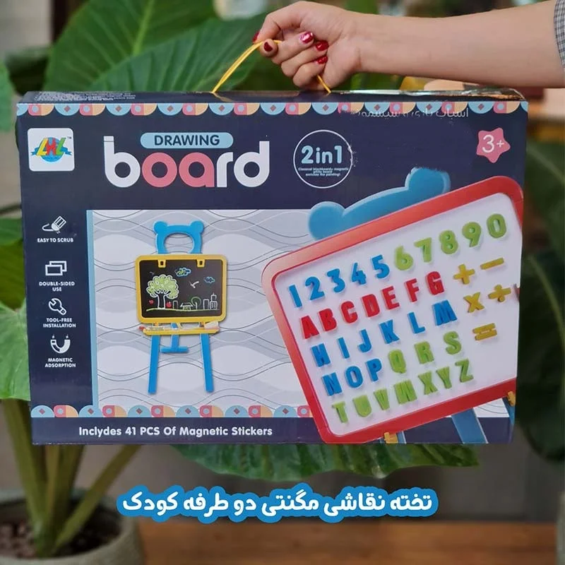 تخته نقاشی مگنتی دو طرفه کودکتخته نقاشی دو طرفه کودک روی یک سه پایه سوار شده. تخته دارای دو سمت سفید و مشکیه. صفحه ای که تخته سفید روش قرار گرفته دارای مگنت هست و می تونید حروف و اعداد انگلیسی رو که همراه اون در بسته بندی موجوده رو به اون بچسبونید . میتونین به راحتی پایه های میز رو در بیارین و از صفحه اش به طور جداگانه برای بازی گروهی استفاده کنین
