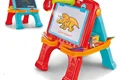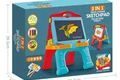تخته نقاشی دو طرفه دارای دو سمت سفید و مشکیه.میباشد همراه این تخته دو طرفه یک بسته ماژیک 12 رنگه موجوده که برای استفاده بر روی تخته وایت برد قابل استفاده هست. همچنین یک بسته گچ 12 رنگه هم برای استفاده بر روی تخته سیاه همراه اون در بسته بندی موجوده. یک عدد پروژکتور جادویی بالای تخته وایت برد نصب میشه که دارای 6 حلقه فیلمه که میتونید به طور جداگانه داخل پروژکتور قرار بدید. هر حلقه دارای 6 طرح مختلف مانند حیوانات ، ماشین ، گل و ... هست که روی تخته یا کاغذی که می تونید به وسیله گیره بالای تخته هست نصب کنید و نمایش بدید تا کودک بتونه از روی اون نقاشی بکشه و لذت نقاشی کشیدن رو تجربه کنه.این تخته قابل حمله و وسایلش رو میتونید داخلش قرار بدید و هر جایی که بخواین میتونین اون رو با خودتون حمل کنید.