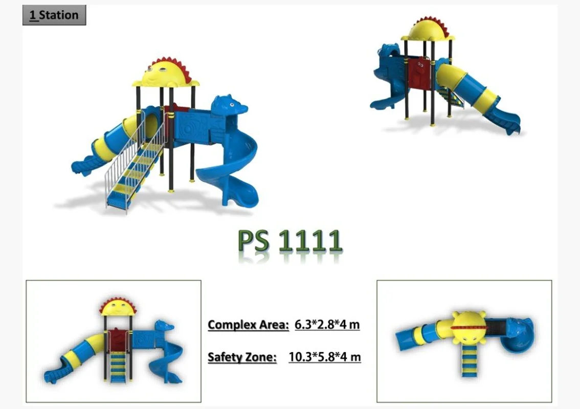 مجموعه بازی پلی اتیلنی کودکان تک ایستگاهی کد (P1111) ، یک مجموعه بازی پارکی شامل یک سرسره تونلی و یک سرسره اسپیرال بصورت مارپیچ میباشد و راه پله آهنی و محکم و ایمن است که پله های پهنی دارد و سایه بان و پنل دیواره برای این مجموعه میباشد و کودکان به راحتی می توانند از آن بالا بروند.