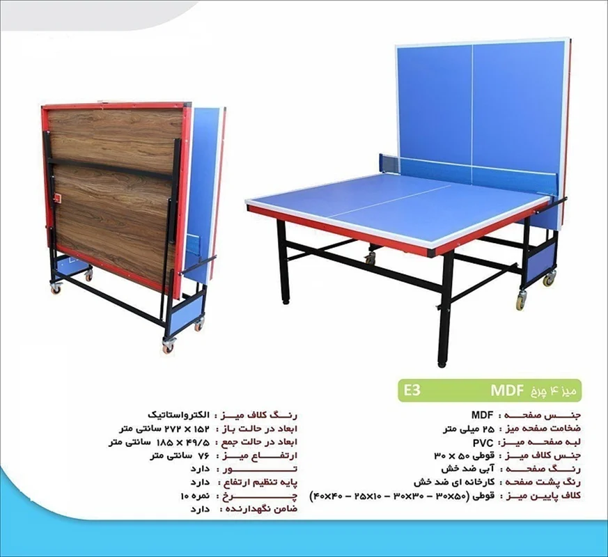 میز پینگ پنگ چهار چرخ مدل E2 از بهترین میزهای موجود در بازار با بهترین کیفیت ساخت و بسیار مقاوم، دارای صفحه MDF ، رنگ الکترواستاتیک کلاف، با پایه های چرخ دار و دارای تور همراه میباشد. جنس صفحه این محصول از MDF با ضخامت 25 میلی متر می باشد.اگر به دنبال یک تجربهی ورزشی و سرگرمکننده هستید که همچنین در خانه قابل تجربه باشد؟ با میز پینگ پنگ 4 چرخ MDF E2، به یک دنیای پر از تفریح و رقابت در سالن پینگ پنگ وارد شوید.