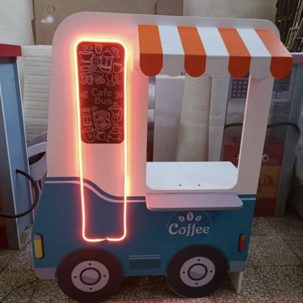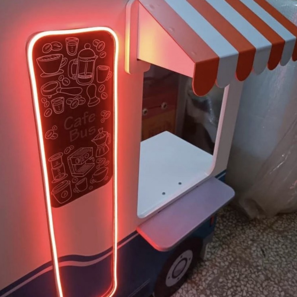 کافه چوبی از جنس ام دی اف روکش ار بوده و دارای طرح ماشین است و بر روی بدنه خود تابلو نئونی دارد که رنگ قرمز دارد. کودکان میتوانند با استفاده از کافه چوبی بازی های نمایشی و مشاغلی انجام دهند تا مهارت های اجتماعی خود را تقویت کنند. کافه چوبی یک محیط کوچک و شبیه سازی شده به یک کافه است و تابلو نئونی استفاده شده باعث شده که این کافه را جذاب تر کند .