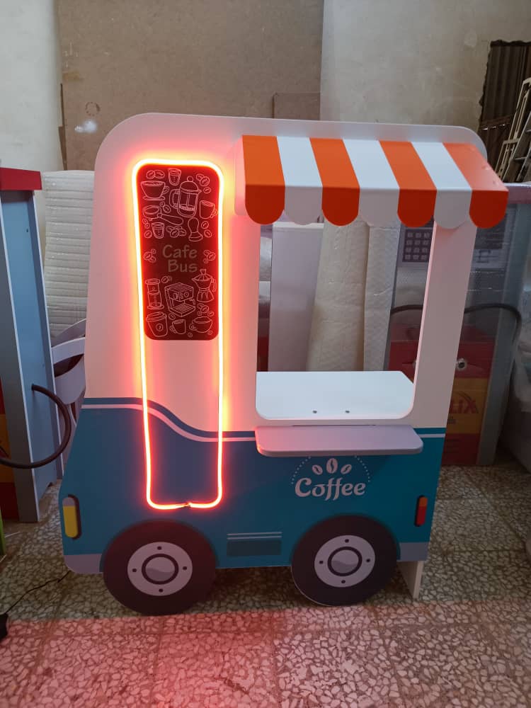 کافه چوبی دارای از جنس ام دی اف روکش ار بوده و در ساخت آن تلاش و دقت بسیاری شده است. کافه چوبی کودک دارای طرح ماشین است و بر روی بدنه خود تابلو نئونی دارد که رنگ قرمز دارد.